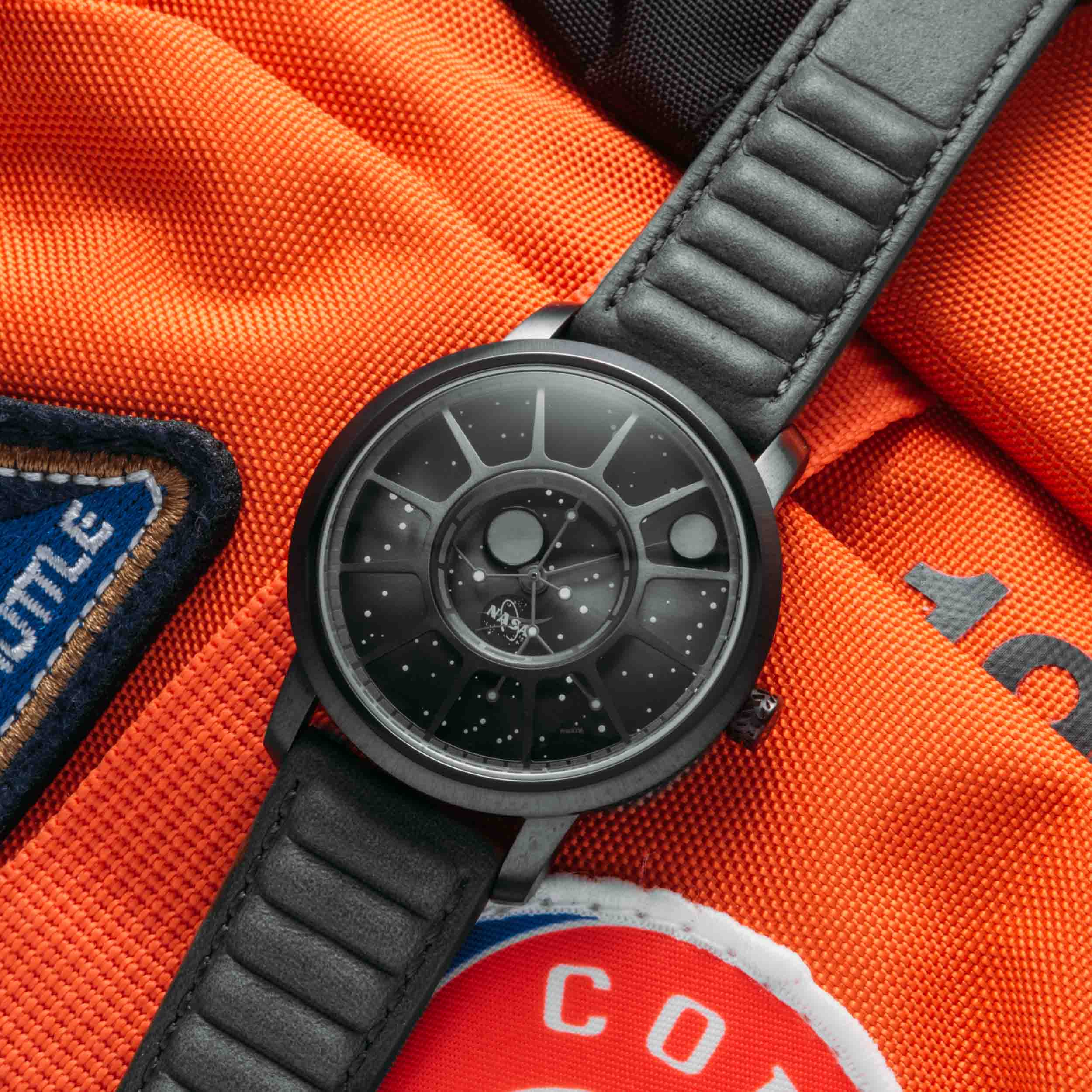 Using our signature method of time telling with orbiting moons as watch hands, the hours and minutes float above the miniature solar system backdrop. The grille was inspired by a spacecraft window giving the sense of looking out at the stars. Swiss Super-LumiNova is printed on the inner and outer edge for improved legibility in both light (and especially) dark conditions.